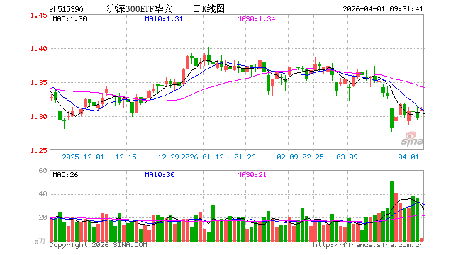 4月1日,沪深300ETF华安(515390)开盘涨0.93%,报1.308元。沪深300ETF华安(515390)重仓股方面,宁德时代开盘涨2.00%,贵州茅台涨1.00%,中国平安涨1.41%,中际旭创涨3.79%,紫金矿业涨3.48%,招商银行涨0.61%,新易盛涨4.22%,美的集团涨0.20%,兴业银行涨0.37%,长江电力涨0.30%。